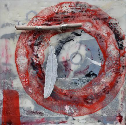 It is Cold Wax and Oil and Collage with a Cairn of stones added as well. It is 12 x 12 on cradled wood board and is framed in a brown/bronze rustic floater frame.